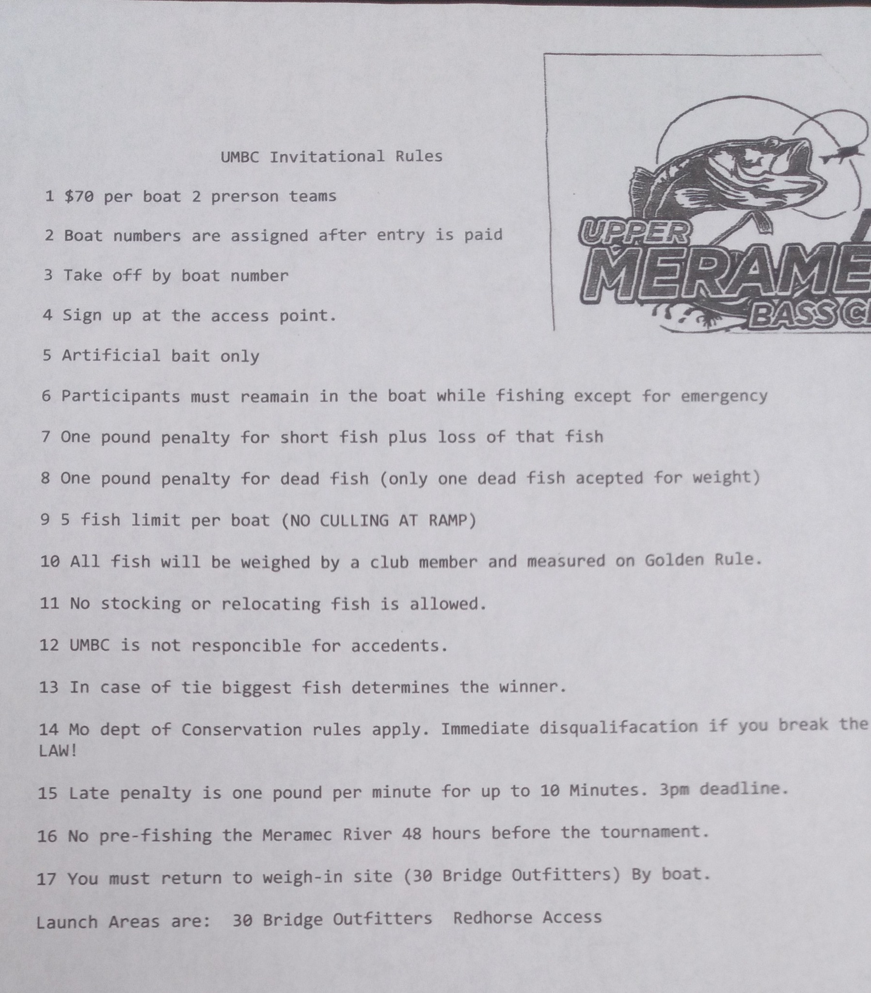 You will be allowed to drop off your partner at Red Horse if you like to bring truck and trailer to weigh-in. [SCOREABLE FISH MUST COME BY BOAT, NO TRAILERING OF FISH]